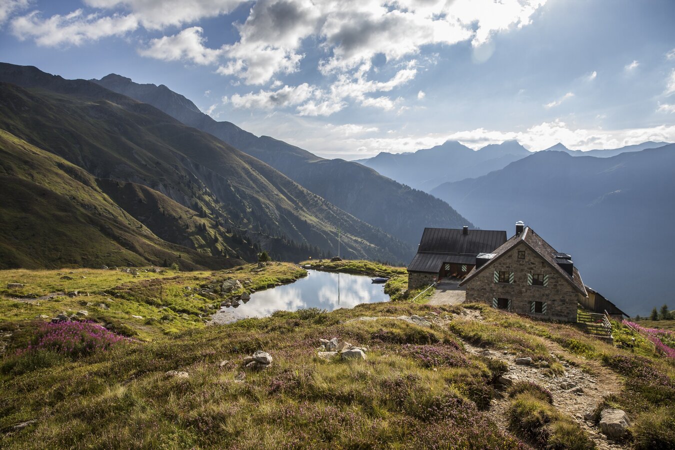 Mit 3,5 Stunden Gehzeit ist Etappe 5 die gemütlichste unter den 9 Etappen. Dennoch gilt es 850 Höhenmeter zu überwinden, bevor man das Etappenziel, die Friedrichshafener Hütte, erreicht. Vom Dorfzentrum Galtür geht es Richtung Ortsteil Außertschafein auf 1.560 m und von hier folgt man der Beschilderung Richtung Friedrichshafener Hütte. Recht anspruchsvoll wurde dieser Weg vom Amt der Tiroler Wildbach- und Lawinenverbauung angelegt. An zwei Stationen sind Informationstafeln angebracht, welche über Vegetation, Forstwirtschaft sowie Verbauungsmaßnahmen informieren. Ab diesem Abschnitt befindet man sich in dem Gebirge der Verwallgruppe von der man einen Panoramablick auf die schon begangene Samnaungruppe auf der gegenüberliegenden Talseite erfolgreich genießen kann. Nachdem man den Grat des Adamsbergs auf ca. 2.330 m passiert hat, führt der Weg leicht bergab über die Flanke der Hohen Köpfe bis zur Friedrichshafener Hütte, die auf 2.138 m liegt.