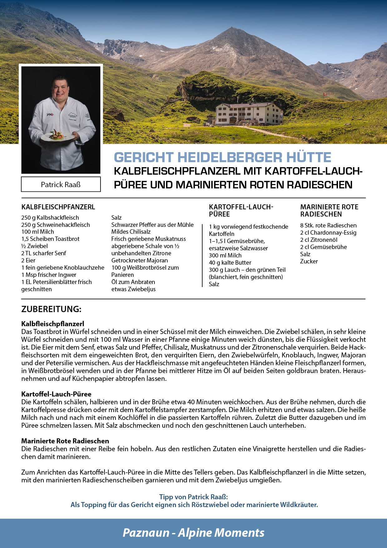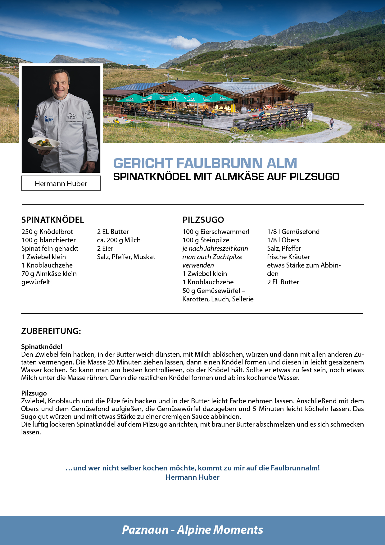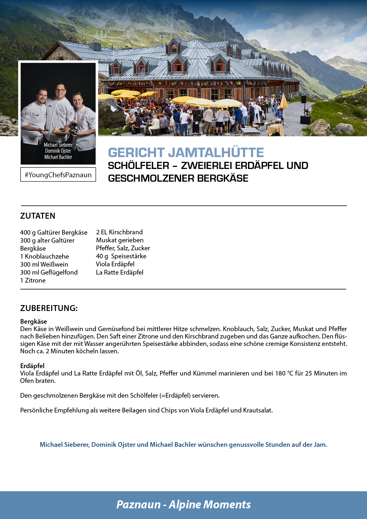 Bei den Hüttenfesten übernehmen sieben Gourmetköche und die #YoungChefsPaznaun die Patenschaft für jeweils eine Hütte und präsentieren ein besonderes Sommergericht, hergestellt aus hochwertigen, regionalen Zutaten. Diese kulinarischen Kreationen sind den ganzen Sommer über in den jeweiligen Hütten verfügbar – ein absoluter Genuss!