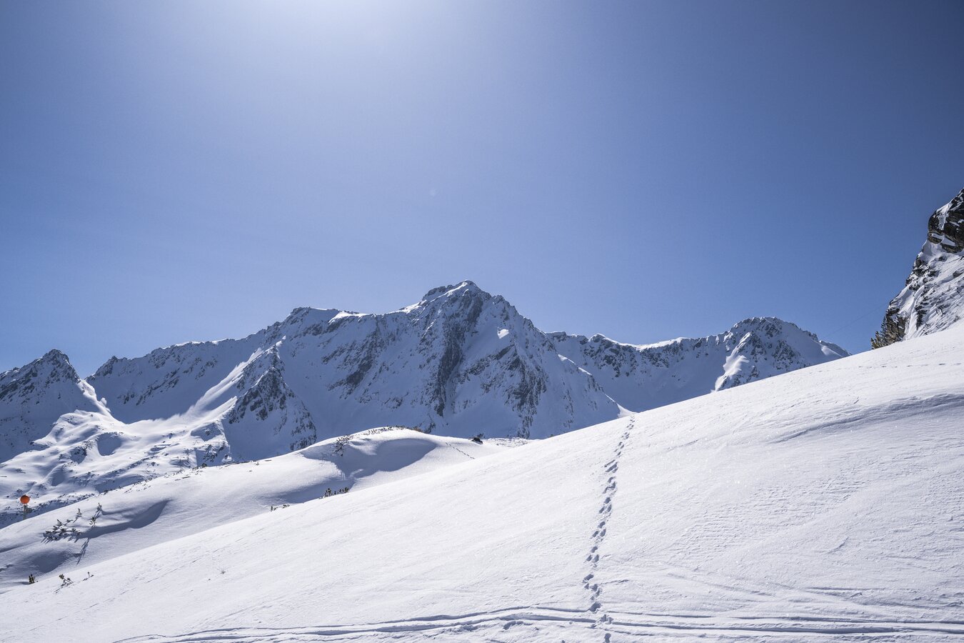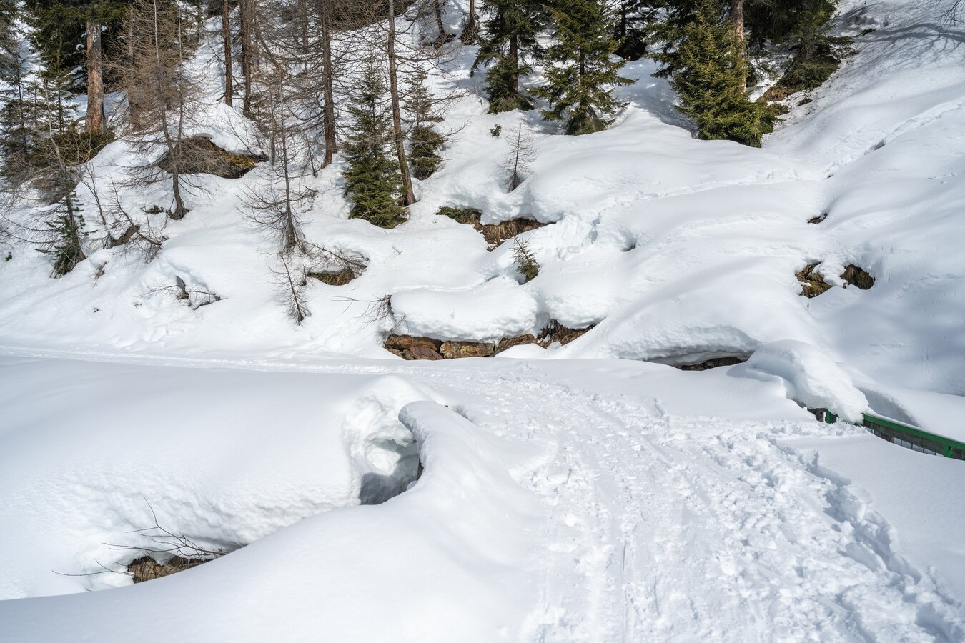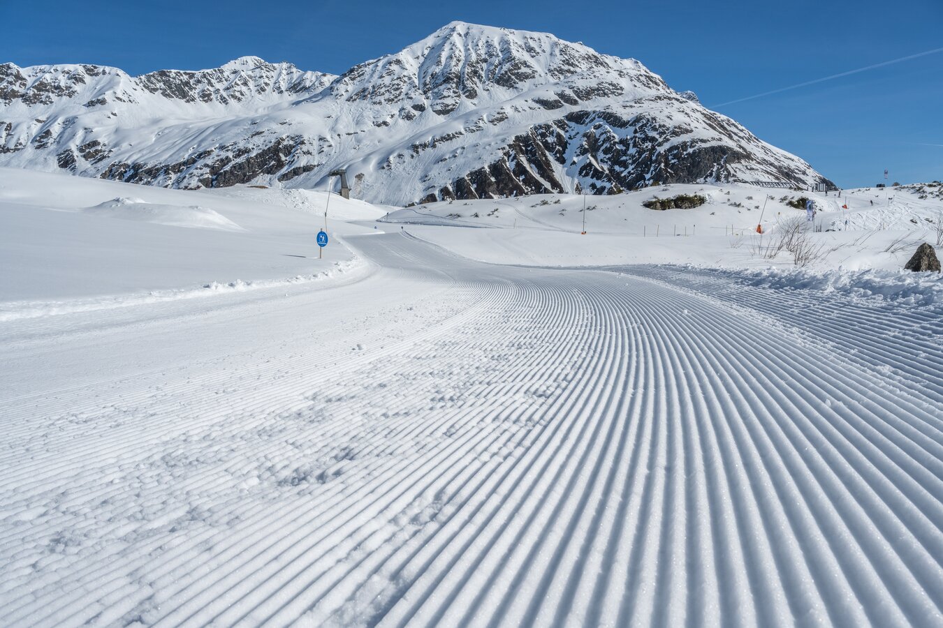 Dieser Weg dient auch als Skipiste, die insbesondere am späteren Nachmittag befahren wird (Talabfahrt nach Samnaun-Compatsch).