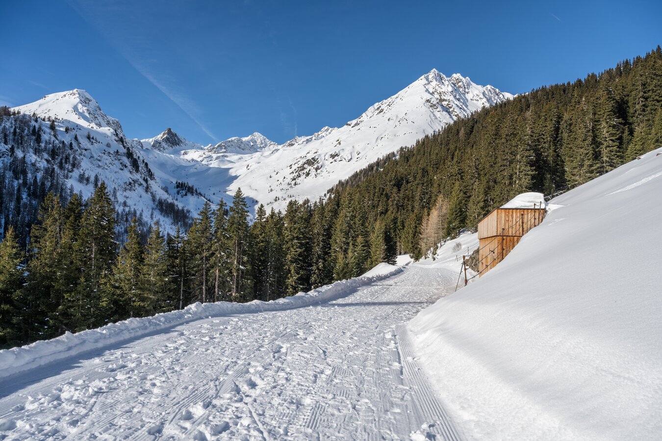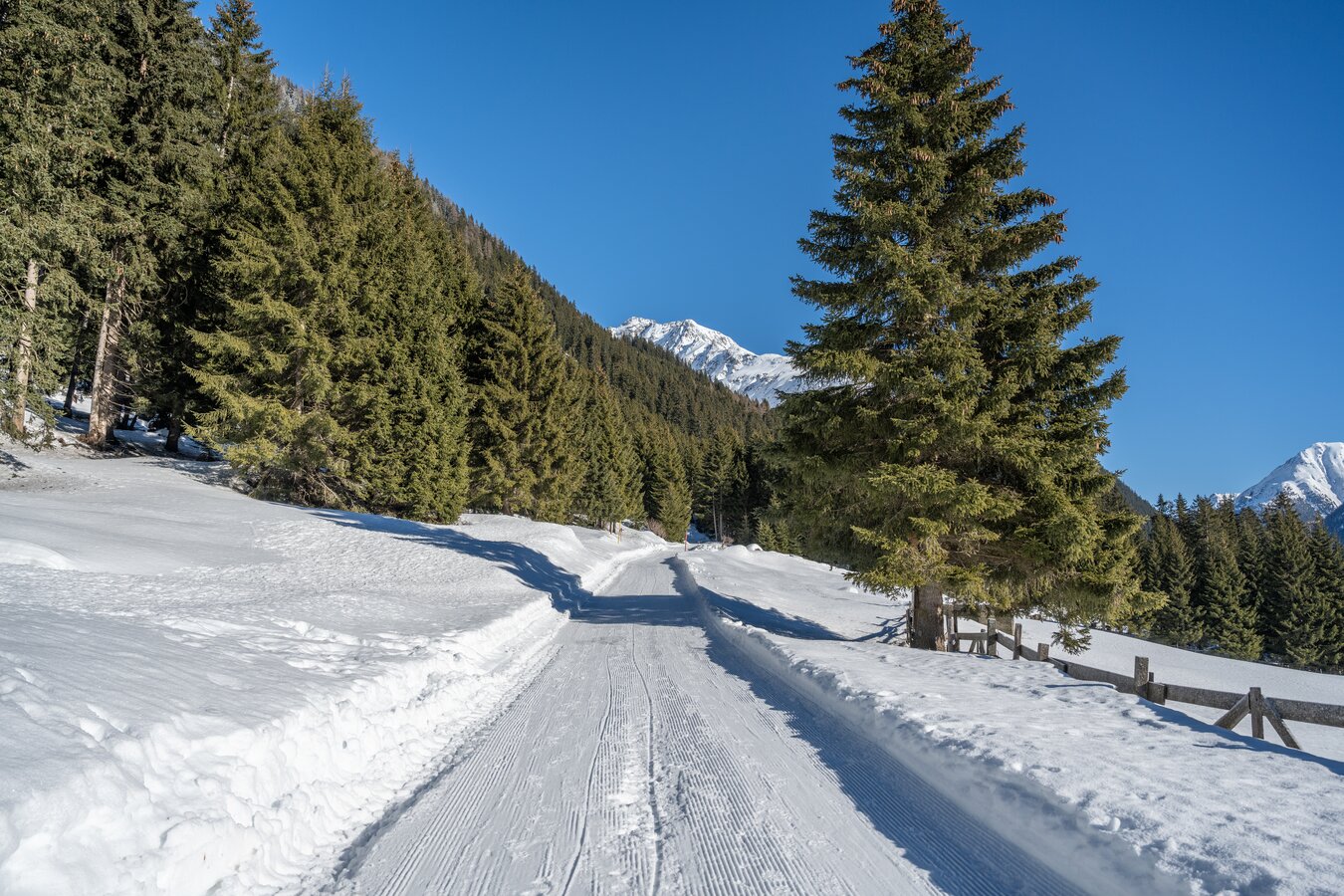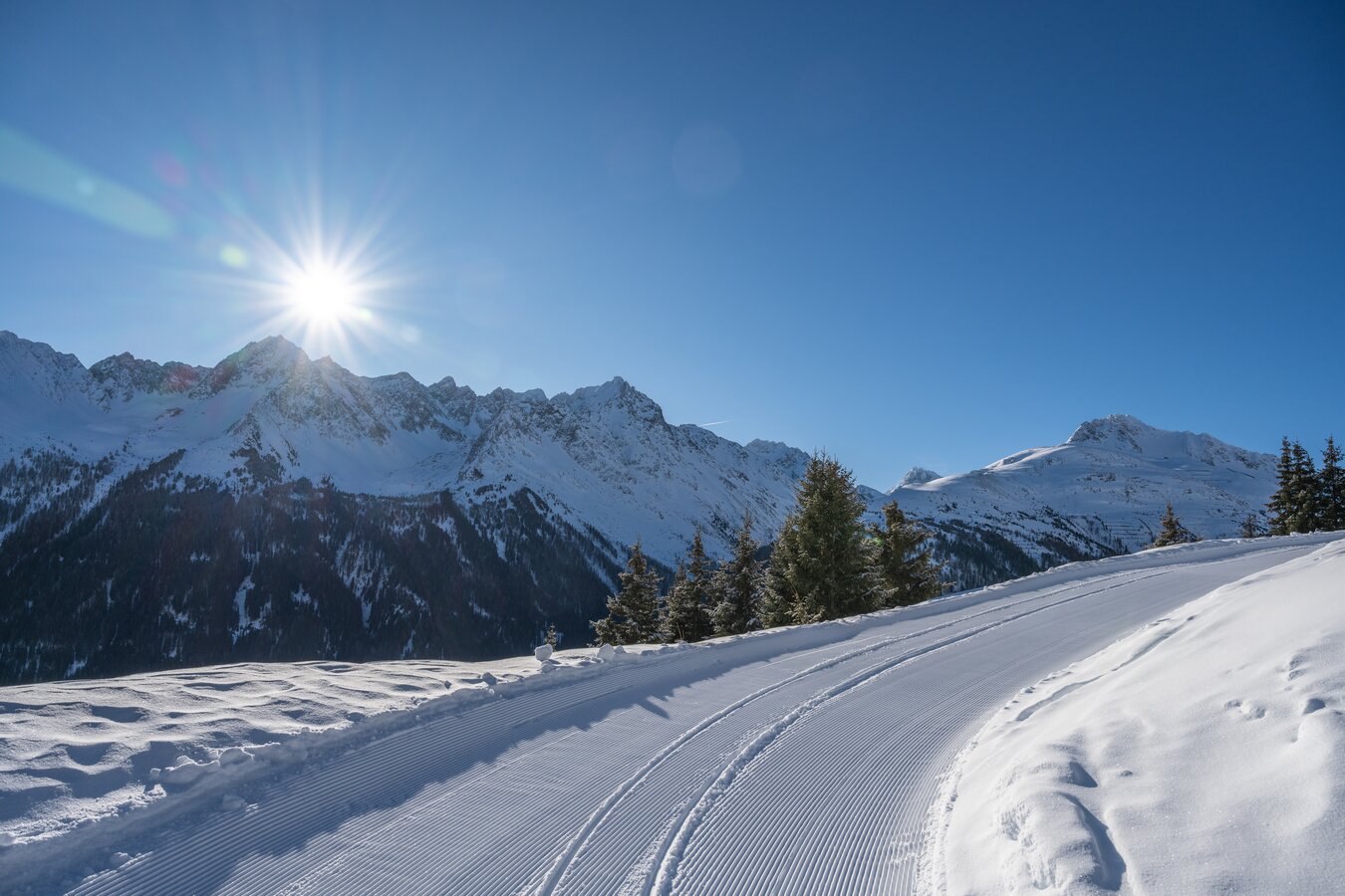 Leichter Winterwanderweg von Galtür bis Kleinzeinis – ideal für einen entspannten Spaziergang in verschneiter Berglandschaft.