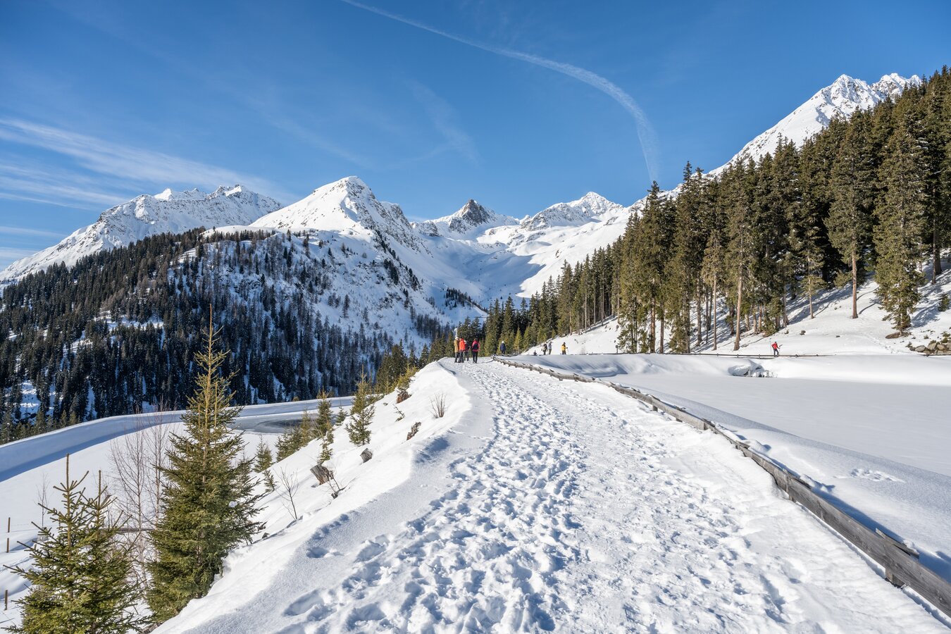 Der Winterwanderweg Kleinzeinis ist ideal für einen entspannten Spaziergang in verschneiter Berglandschaft. Er verläuft größtenteils flach entlang der Trisanna, der Einstieg befindet sich direkt vor dem Hotel Landle in Galtür. Der gut präparierte Weg erfordert keine besondere Kondition und eignet sich perfekt für einen gemütlichen Winterspaziergang.
