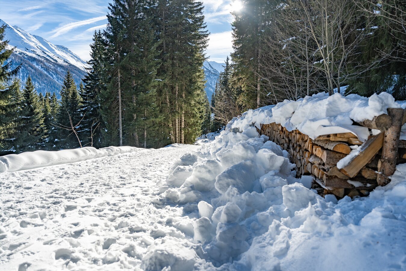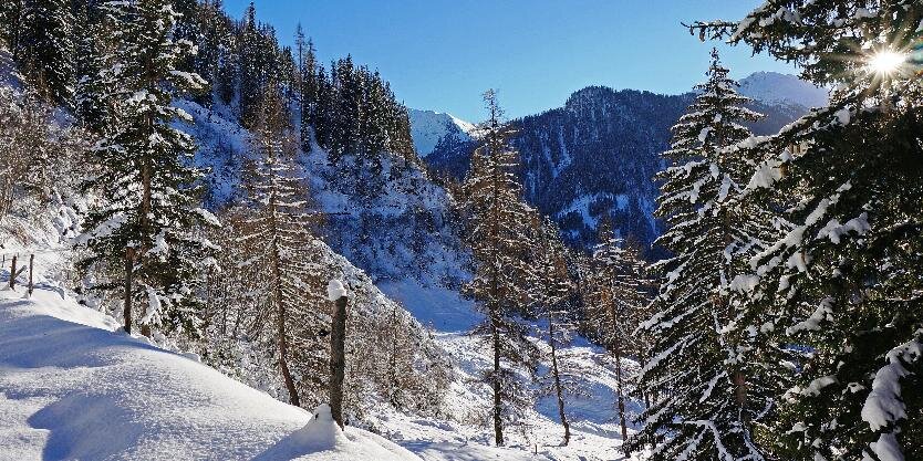 Winterwanderweg von Samnaun-Compatsch immer leicht ansteigend durch den Mischwald ins Val da Mot und nach Mottas Lungas mit einem Ausblick in das Samnauntal und das benachbarte Spiss.