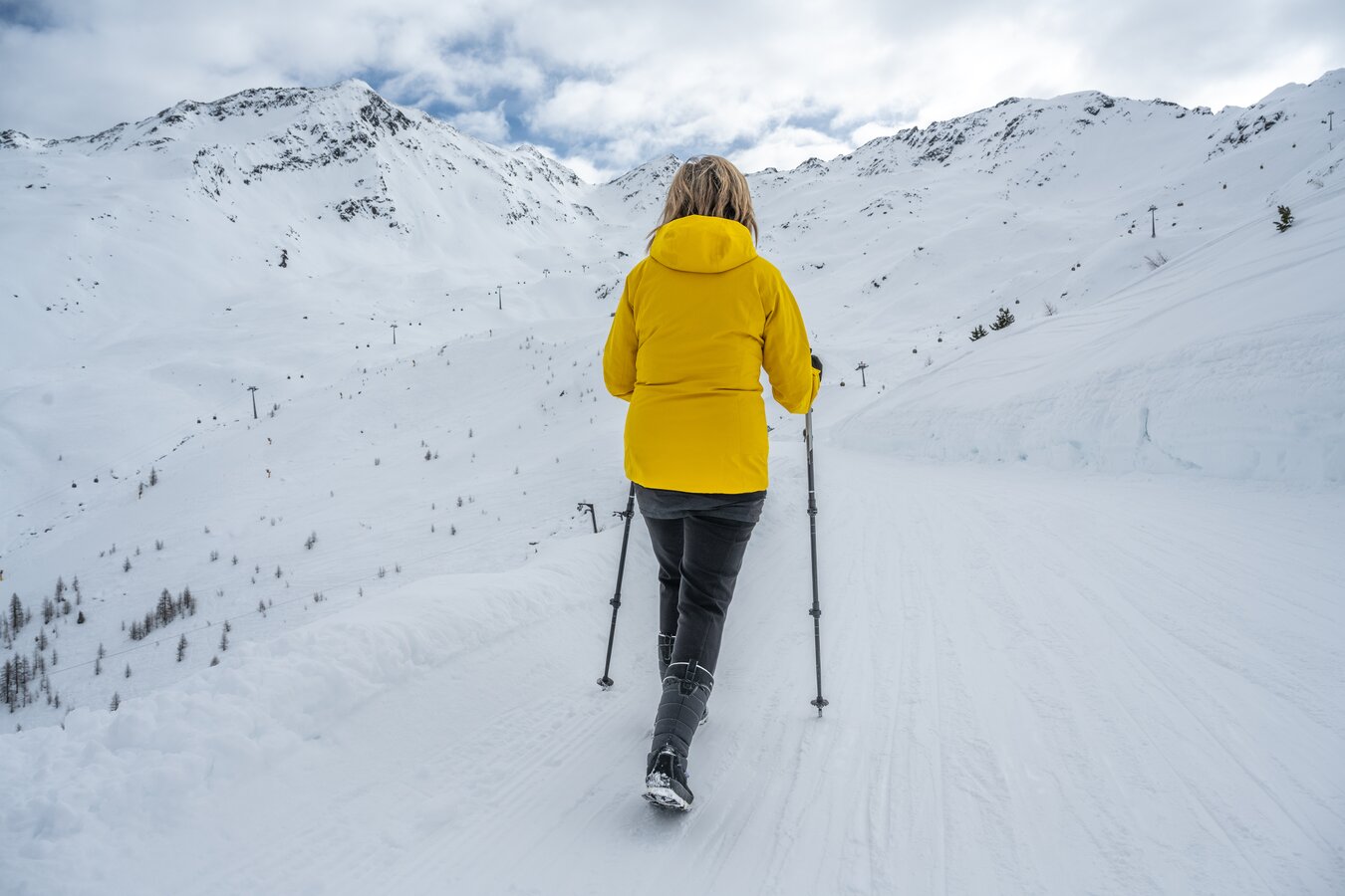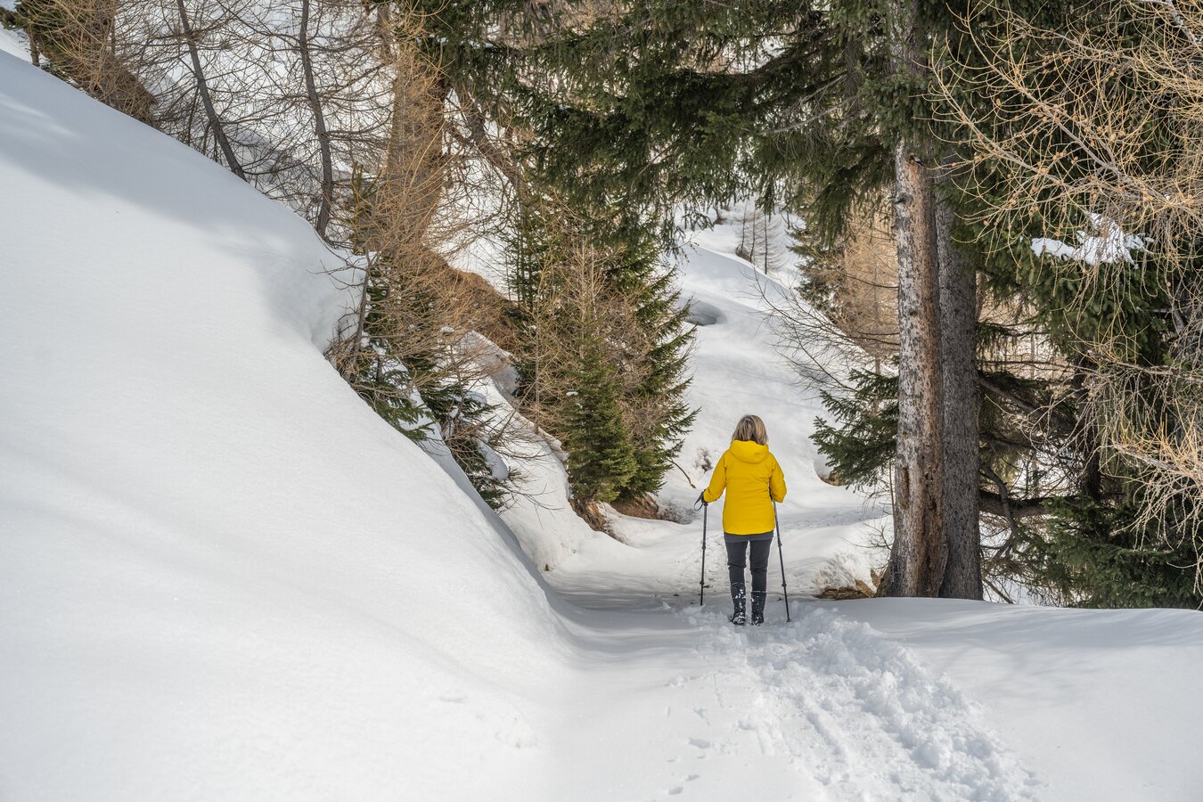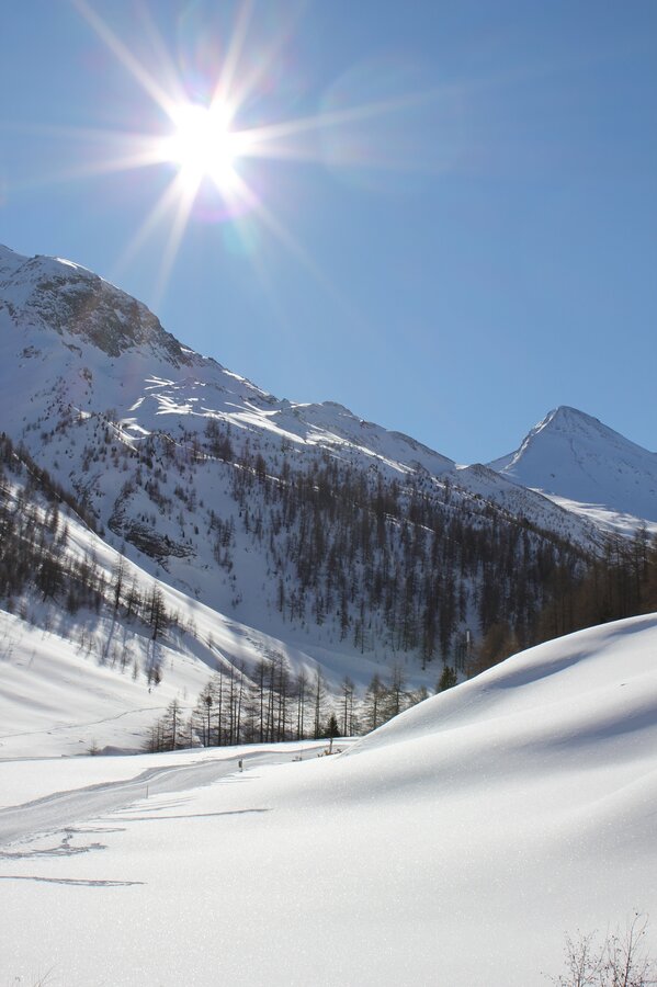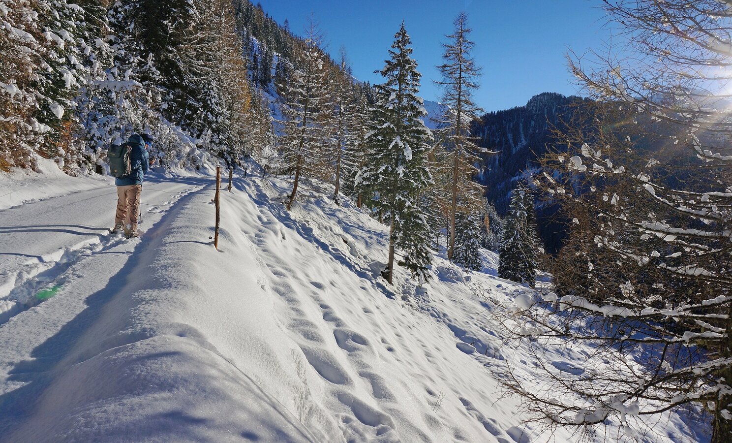 Die Winterwanderung führt durch die verschneite Landschaft, vorbei an glitzernden Schneefeldern und verschneiten Hängen.