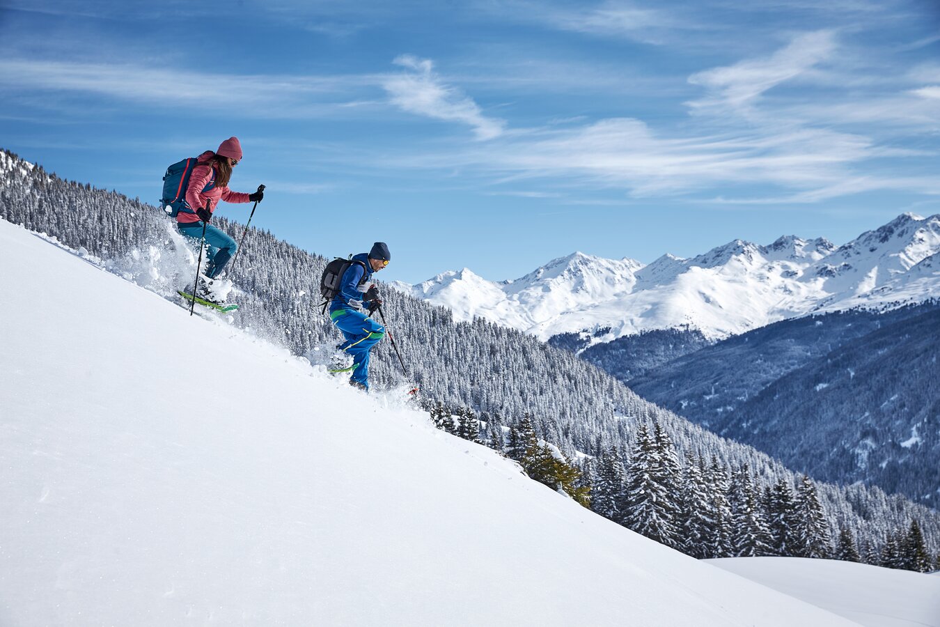 Der Winterwanderweg auf die Mutta führt in Serpentinen durch tief verschneite Wälder und belohnt dich mit grandiosen Ausblicken auf Ischgl.
