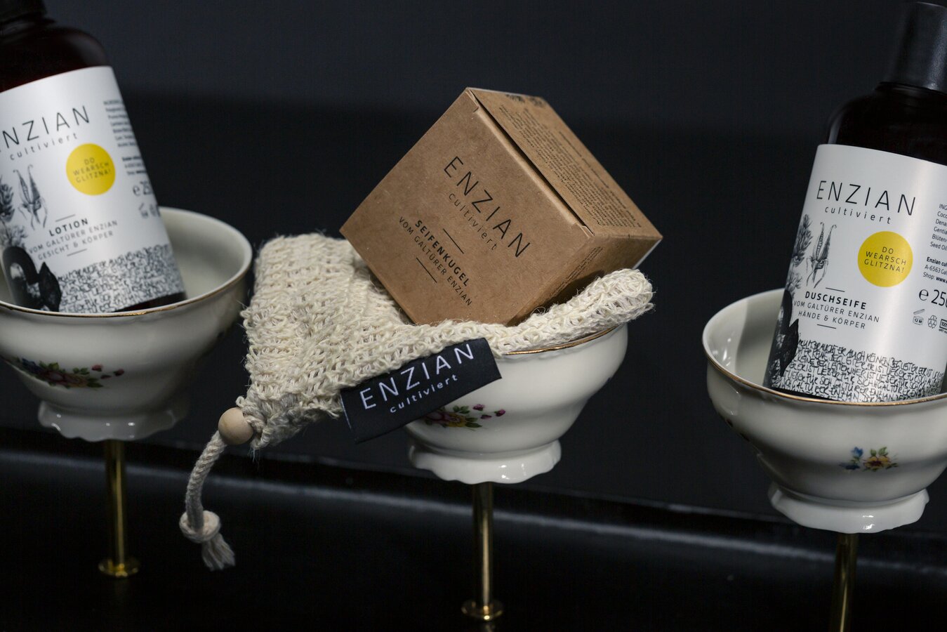Today, the uses of the gentian have expanded: the leaves and flowers are also used in high-quality care products. The intensive manual work that the innovators behind ‘Enzian Cultiviert’ do to cultivate the gentian every year is remarkable and shows the passion for this traditional plant. The products made from it – from hand cream to lotions to shower soaps – offer care for the skin and use the antibacterial and regenerative properties of the gentian.